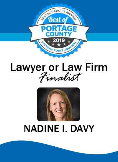 Congratulations to Attorney Nadine Davy for being named a finalist in this year’s Stevens Point Journal Readers’ Choice Awards for Lawyer or Law Firm. Nadine has been an attorney for 35 years, 22 of those in the area of Family Law. Over the years, Nadine has represented clients on custody and placement issues and the multiple financial aspects of divorce, including maintenance, child support and property division. We are honored and grateful that one of our exceptional attorneys has been recognized by the community for her hard work and dedication. Click the link to see all the results for the 2019 Best of Portage County.